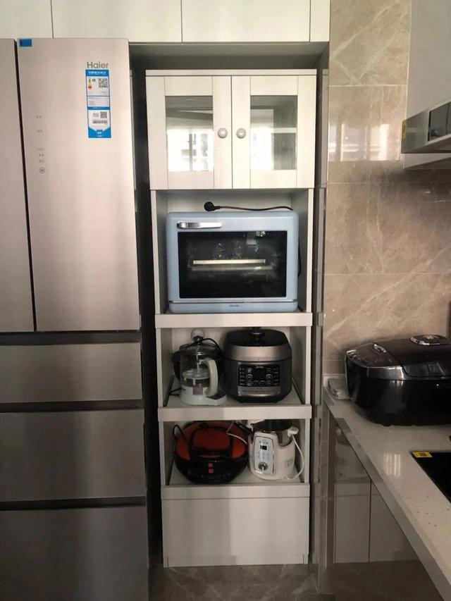 可以在厨房设计一组高柜,集中存放微波炉、电饭煲、空气炸锅等家电。