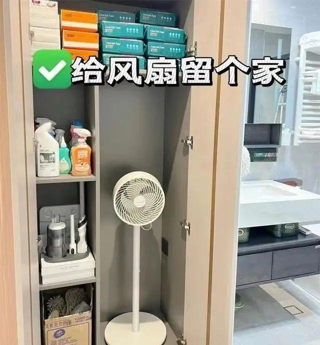 作一个家政柜,根据电风扇的尺寸量身定制收纳空间,可选在家政柜或阳台储物柜中。