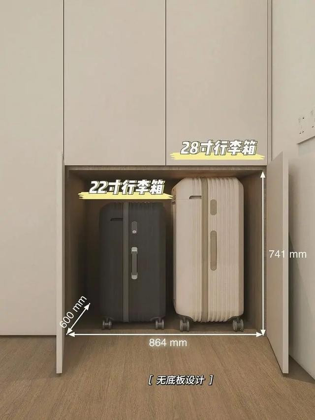 如果玄关没有空间,可以在衣柜里预留一个750mm高、810mm宽的专属区域,足够存放3个24寸的行李箱,还有余地放一些小物品。